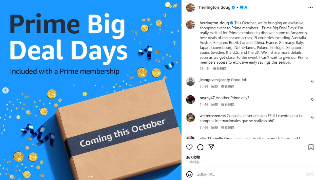 这场大促活动将横跨19个国家,包括澳大利亚、奥地利、比利时、巴西、加拿大、中国、法国、德国、意大利、日本、卢森堡、荷兰、波兰、葡萄牙、新加坡、西班牙、瑞典、美国和英国,为Prime会员们敞开购物新天地。