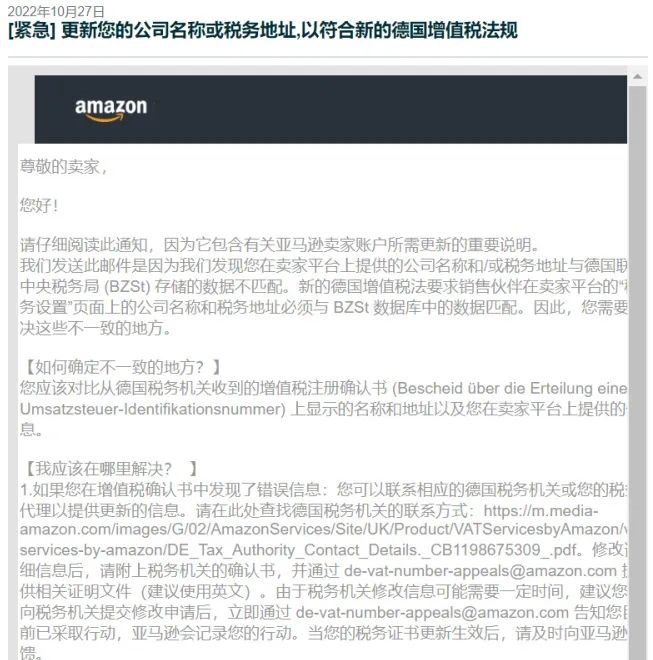 根据亚马逊最新的德国增值税法合规要求,在亚马逊卖家平台上提供的公司名称和税务地址需要与德国联邦中央税务局(BZSt)存储的数据保持一致。
